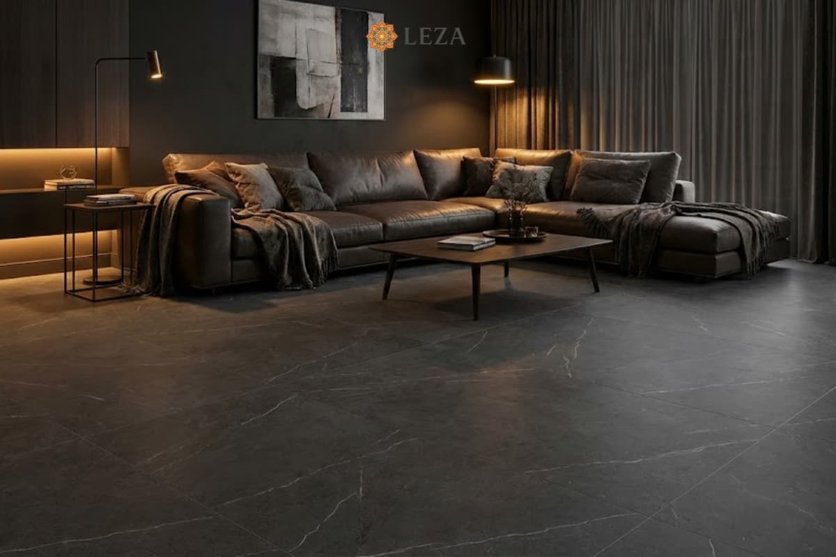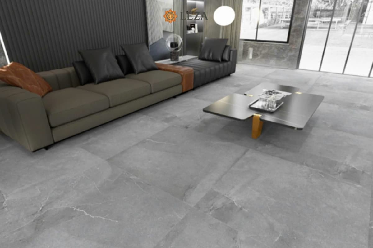 Sử dụng VT88032M lát nền phòng khách sẽ tạo nên một không gian “chất lừ”, nam tính và phóng khoáng. Kết hợp với sofa da màu nâu bò, tường bê tông mài hoặc nội thất kim loại đen sẽ tạo nên phong cách Industrial chuẩn mực.