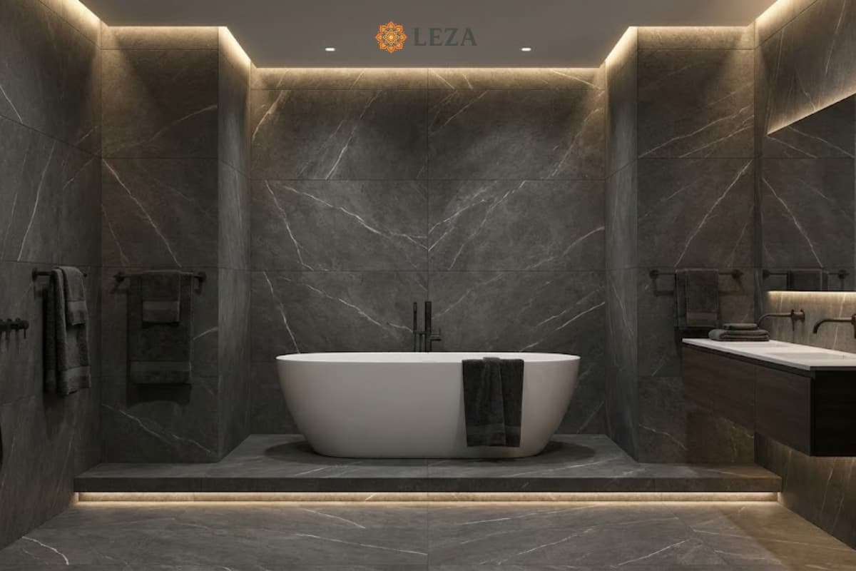 Xu hướng phòng tắm màu tối đang lên ngôi. Màu xám chì giúp phòng tắm trở nên bí ẩn, quyến rũ như trong các resort cao cấp. Bề mặt Matt đảm bảo bạn luôn vững chân trên sàn ướt.